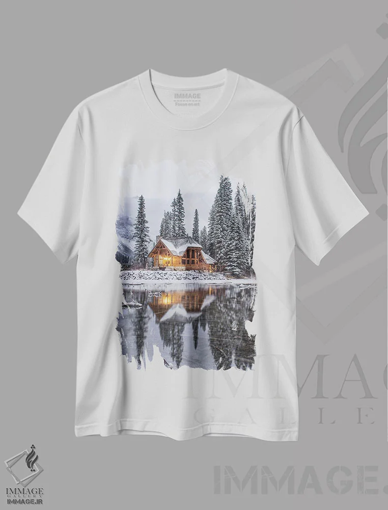 تیشرت سفید طرح دار کلبه کنار دریاچه زمرد در برف، مدیوم اثر کارن منداو | فروشگاه ایماژ تیشرت طرح دار کلبه کنار دریاچه زمرد در برف اثر کارن منداو