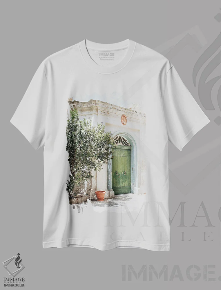 تیشرت سفید طرح دار درب سبز در ایتالیا، مدیوم اثر کارن منداو | فروشگاه ایماژ تیشرت طرح دار درب سبز در ایتالیا اثر کارن منداو