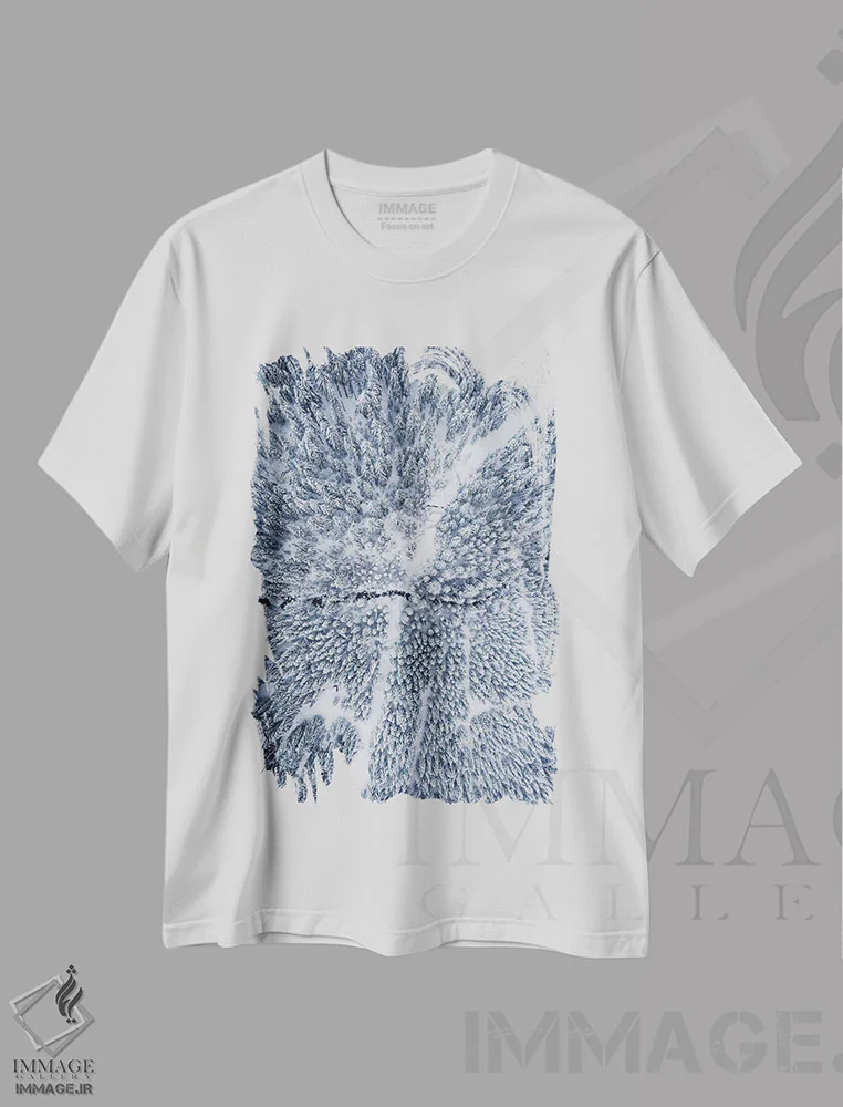 تیشرت سفید طرح دار تاب آبی در برف، عکاسی ماکرو اثر کارن منداو | فروشگاه ایماژ تیشرت طرح دار تاب آبی در برف اثر کارن منداو