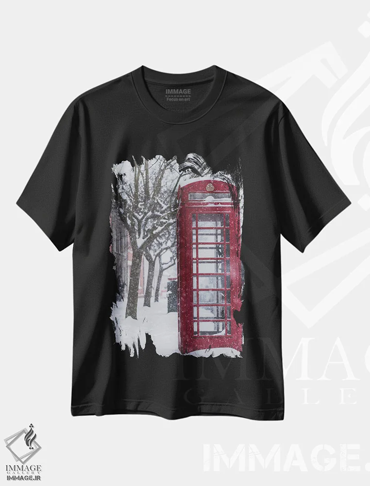 تیشرت مشکی طرح دار غرفه تلفن لندن در برف، مدیوم اثر کارن منداو | فروشگاه ایماژ تیشرت طرح دار غرفه تلفن لندن در برف اثر کارن منداو
