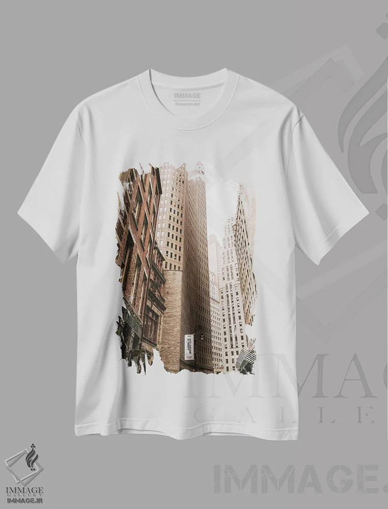 تیشرت سفید طرح دار ساختمان های نیویورک، مدیوم اثر کارن منداو | فروشگاه ایماژ تیشرت طرح دار ساختمان های نیویورک اثر کارن منداو
