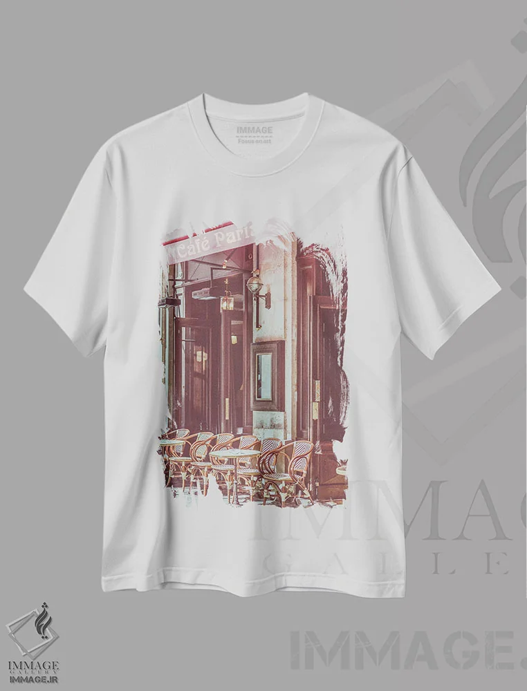 تیشرت سفید طرح دار کافه پاریس، تزئینی اثر کارن منداو | فروشگاه ایماژ تیشرت طرح دار کافه پاریس اثر کارن منداو