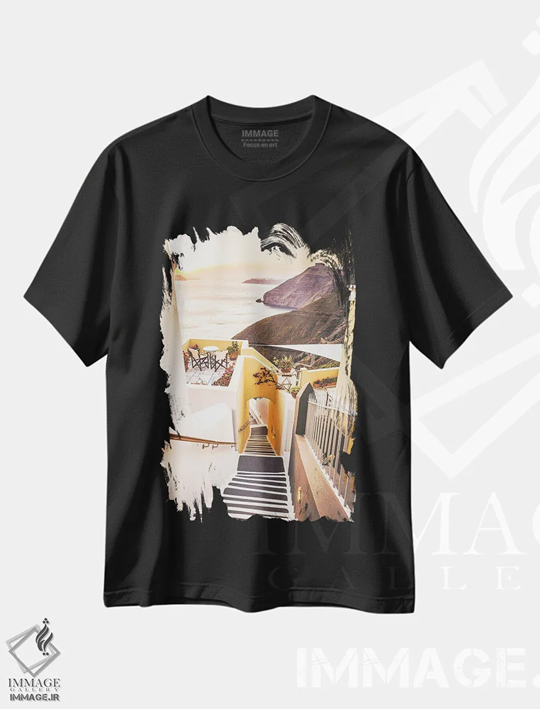 تیشرت مشکی طرح دار پله های سانتورینی در غروب آفتاب، مدیوم اثر کارن منداو | فروشگاه ایماژ تیشرت طرح دار پله های سانتورینی در غروب آفتاب اثر کارن منداو