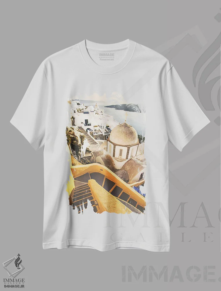 تیشرت سفید طرح دار غروب سانتورینی، مدیوم اثر کارن منداو | فروشگاه ایماژ تیشرت طرح دار غروب سانتورینی اثر کارن منداو
