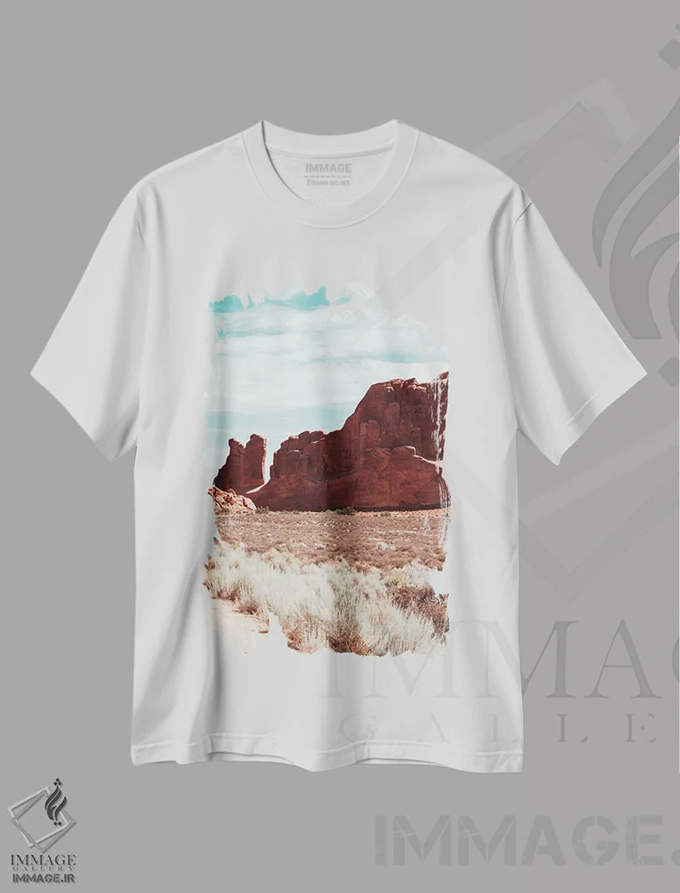 تیشرت سفید طرح دار چشم انداز آریزونا، مدیوم اثر کارن منداو | فروشگاه ایماژ تیشرت طرح دار چشم انداز آریزونا اثر کارن منداو