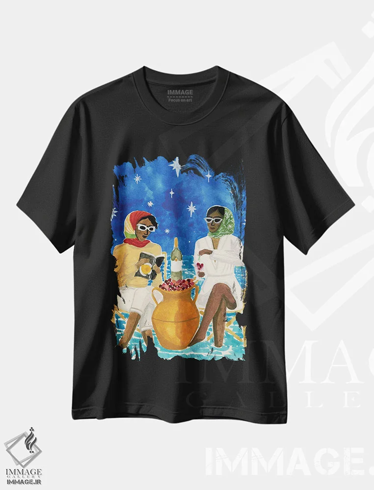 تیشرت مشکی طرح دار تعطیلات مدیترانه ای، هنر آمریکایی آفریقایی تبار اثر کارولین چسیا | فروشگاه ایماژ تیشرت طرح دار تعطیلات مدیترانه ای اثر کارولین چسیا