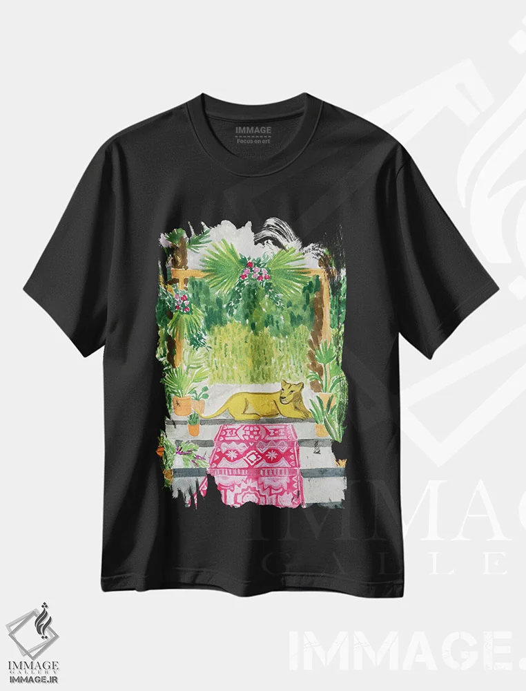 تیشرت مشکی طرح دار شیر ماده در محراب، تزئینی اثر کارولین چسیا | فروشگاه ایماژ تیشرت طرح دار شیر ماده در محراب اثر کارولین چسیا