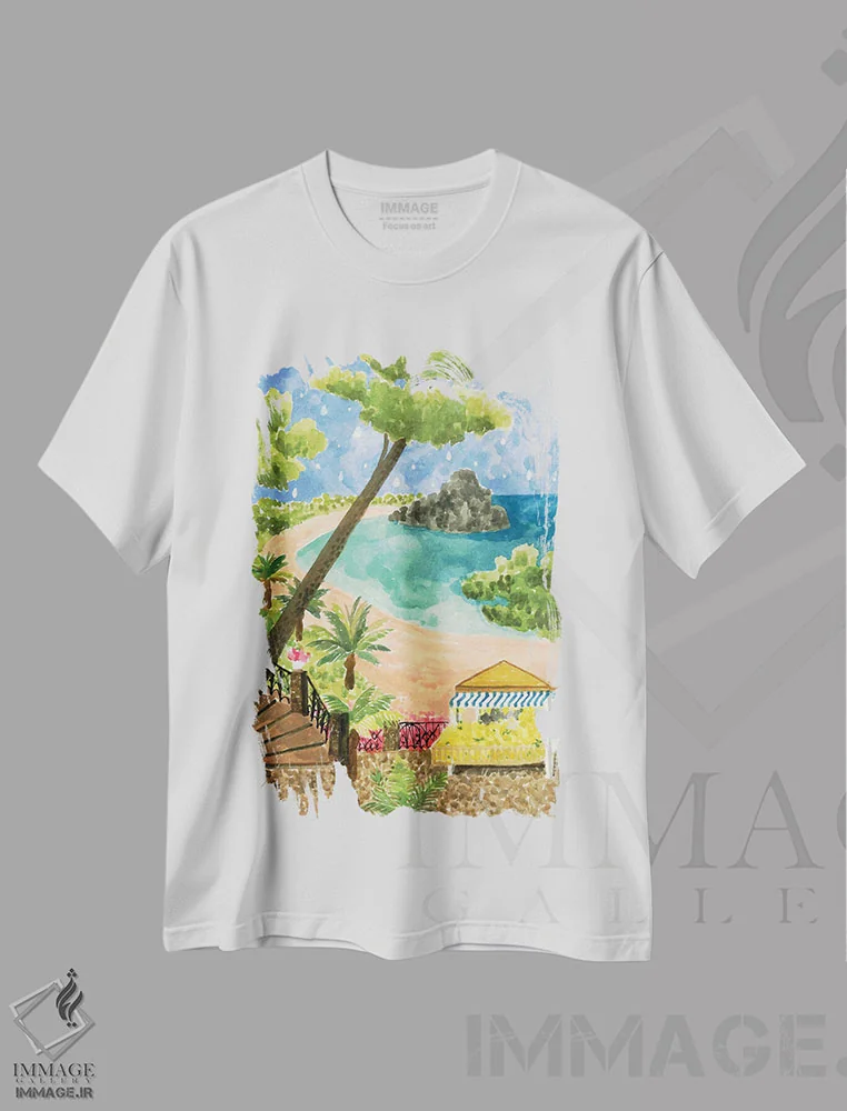 تیشرت سفید طرح دار تابستان ایتالیایی، دکور ساحلی اثر کارولین چسیا | فروشگاه ایماژ تیشرت طرح دار تابستان ایتالیایی اثر کارولین چسیا