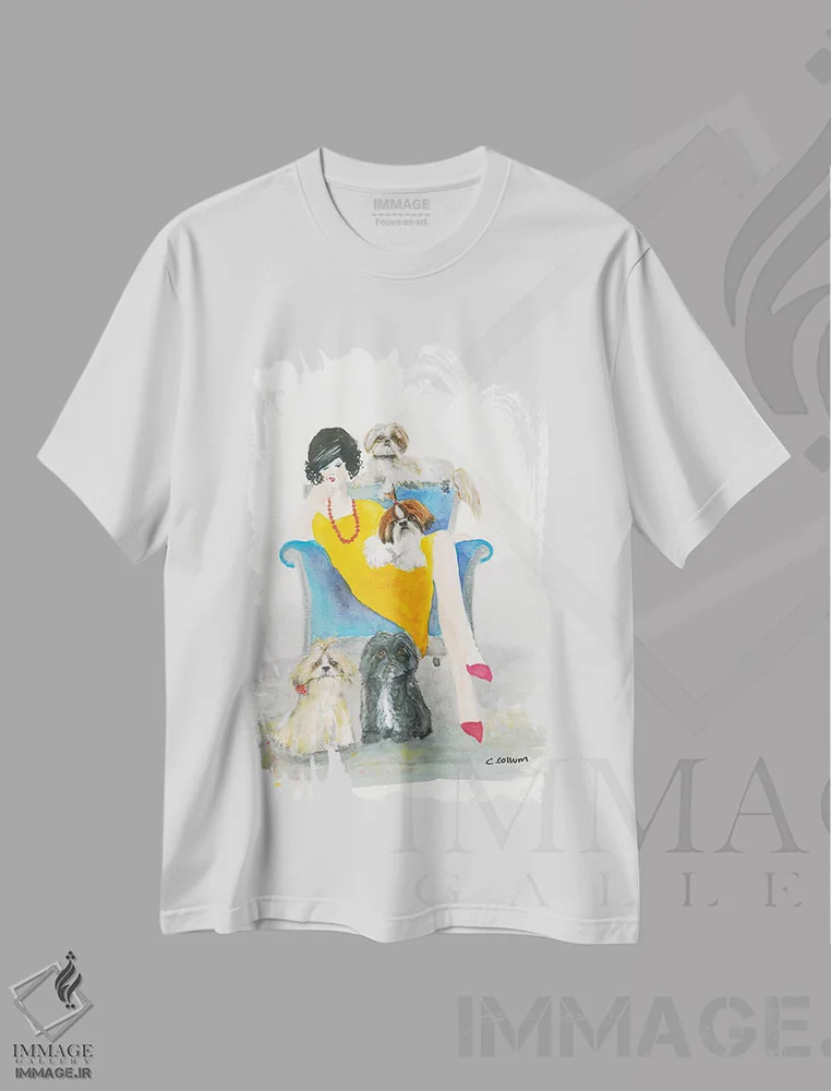 تیشرت سفید طرح دار زیبا نشسته، دکور معاصر اثر کانی کالم | فروشگاه ایماژ تیشرت طرح دار زیبا نشسته اثر کانی کالم
