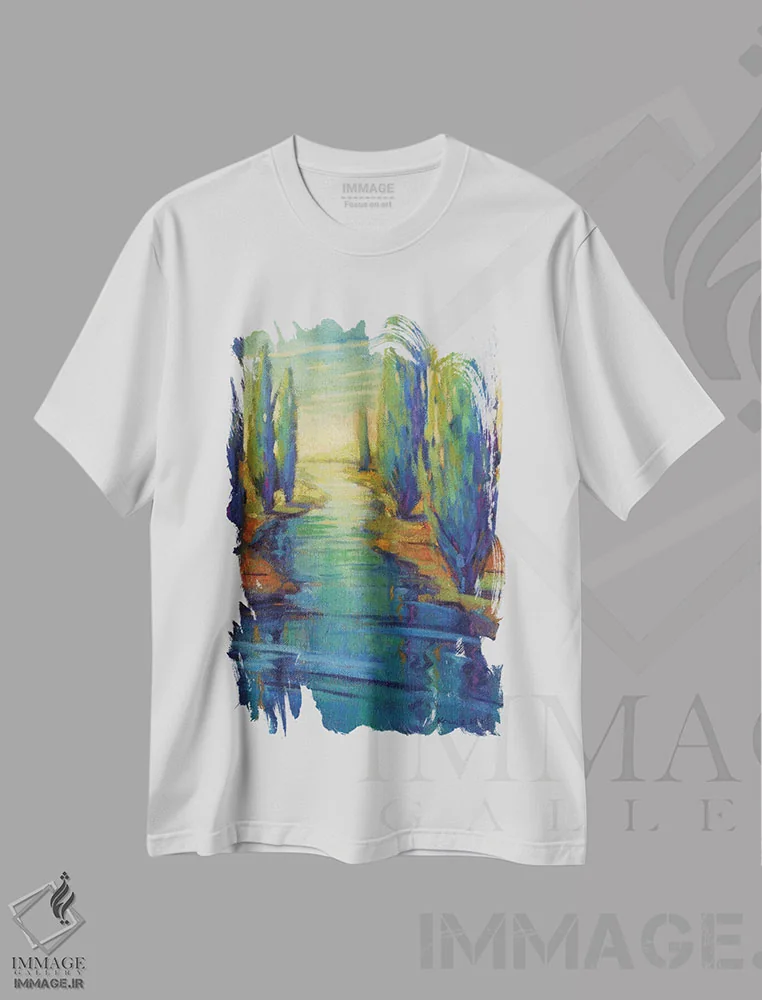 تیشرت سفید طرح دار در امتداد جویبار، دکور معاصر اثر کانی کیم | فروشگاه ایماژ تیشرت طرح دار در امتداد جویبار اثر کانی کیم
