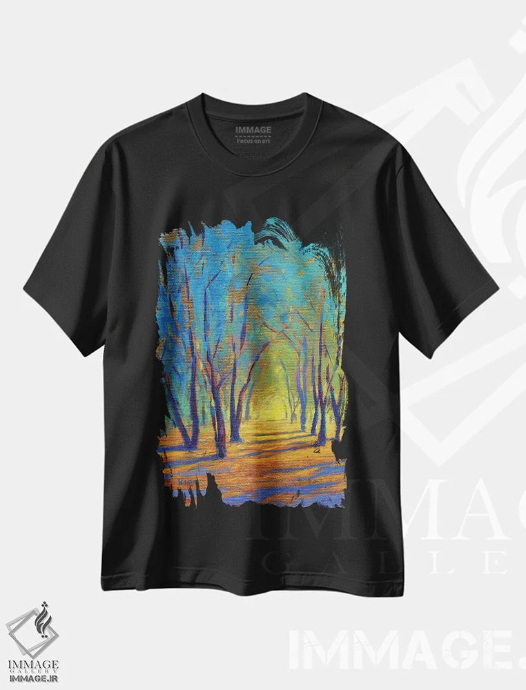 تیشرت مشکی طرح دار انعکاس سروها، دکور معاصر اثر کانی کیم | فروشگاه ایماژ تیشرت طرح دار انعکاس سروها اثر کانی کیم