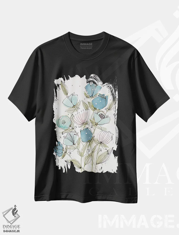 تیشرت مشکی طرح دار گل های وحشی آبرنگی آبی ۲، تزئینی اثر کرینلاکس | فروشگاه ایماژ