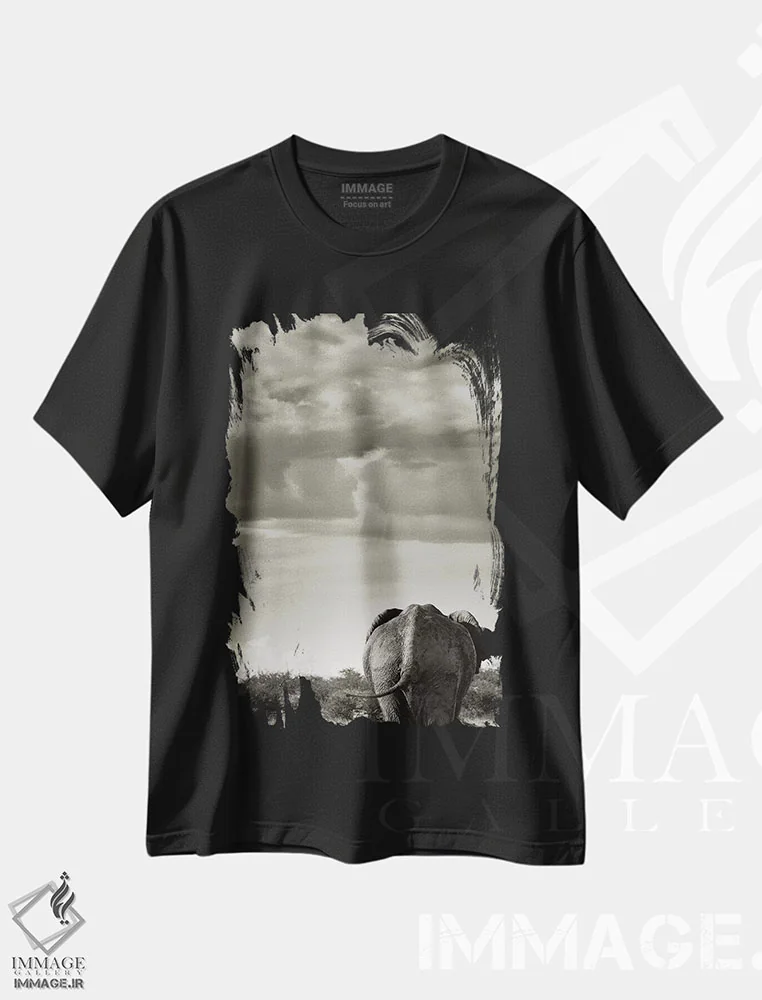 تیشرت مشکی طرح دار فیل سیاه و سفید در حال بازگشت، عکاسی سیاه و سفید اثر کلاوس تیدگه | فروشگاه ایماژ تیشرت طرح دار فیل سیاه و سفید در حال بازگشت اثر کلاوس تیدگه