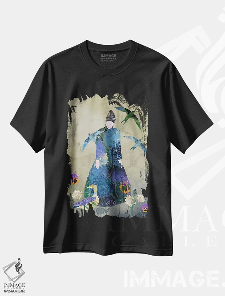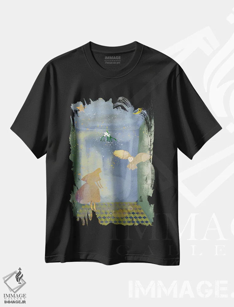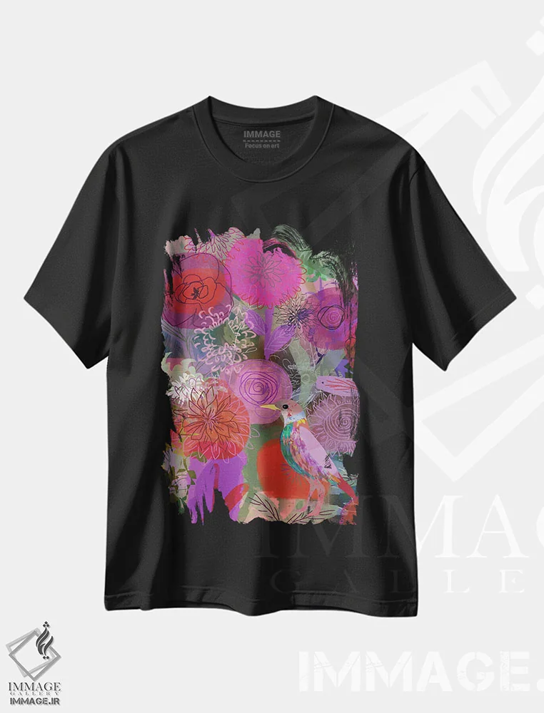 تیشرت مشکی طرح دار پرستو، هنر دیجیتال اثر کلر وست وود | فروشگاه ایماژ تیشرت طرح دار پرستو اثر کلر وست وود