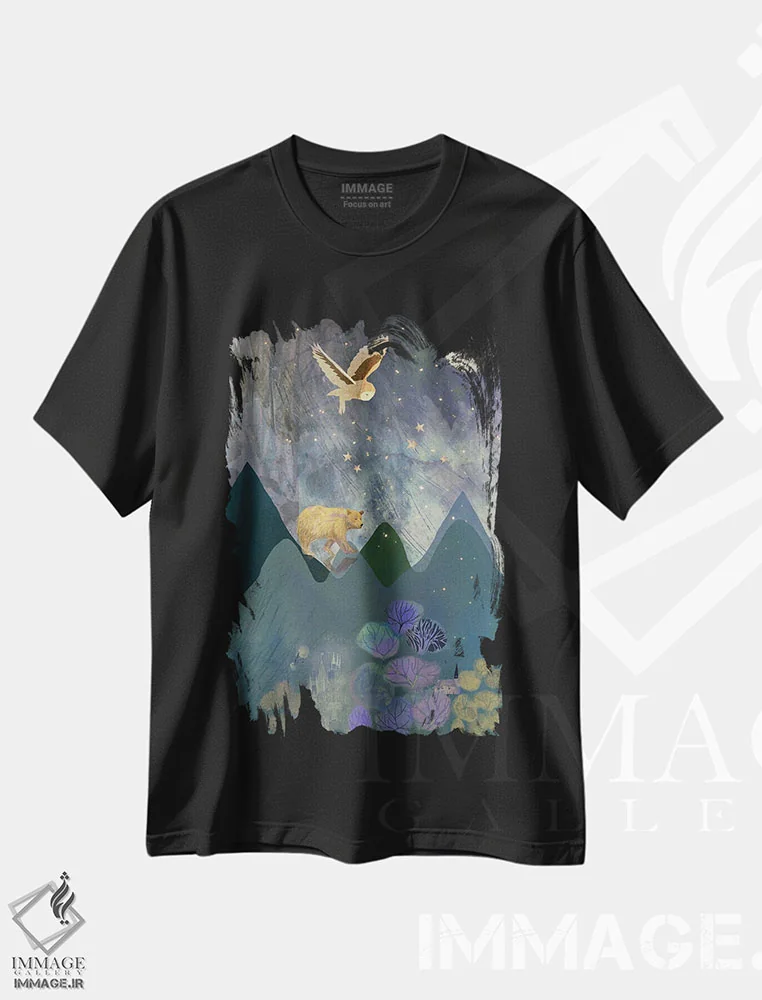 تیشرت مشکی طرح دار خرس و جغد، هنر دیجیتال اثر کلر وست وود | فروشگاه ایماژ تیشرت طرح دار خرس و جغد اثر کلر وست وود