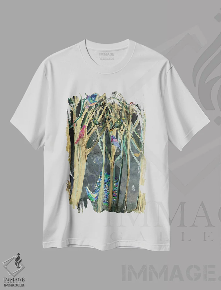تیشرت سفید طرح دار درخت پرندگان، هنر دیجیتال اثر کلر وست وود | فروشگاه ایماژ تیشرت طرح دار درخت پرندگان اثر کلر وست وود