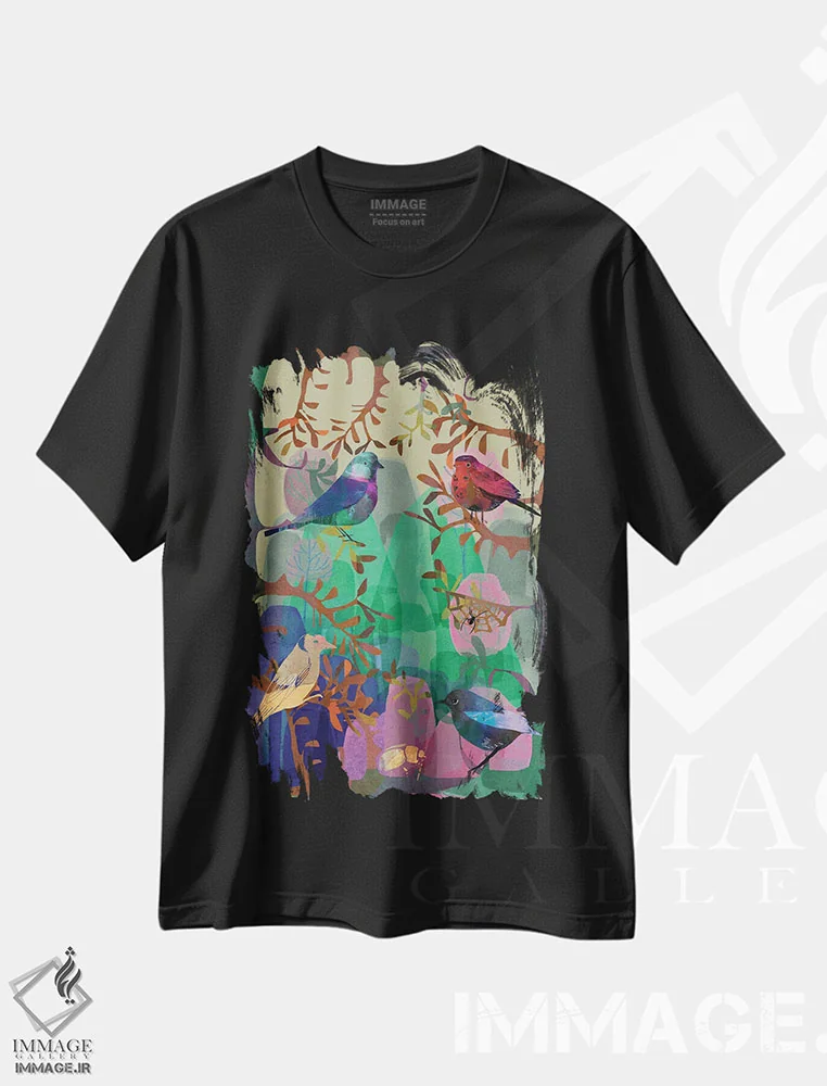 تیشرت مشکی طرح دار پرندگان فراوان، هنر دیجیتال اثر کلر وست وود | فروشگاه ایماژ تیشرت طرح دار پرندگان فراوان اثر کلر وست وود