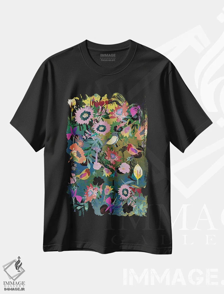 تیشرت مشکی طرح دار گل دار، هنر دیجیتال اثر کلر وست وود | فروشگاه ایماژ تیشرت طرح دار گل دار اثر کلر وست وود