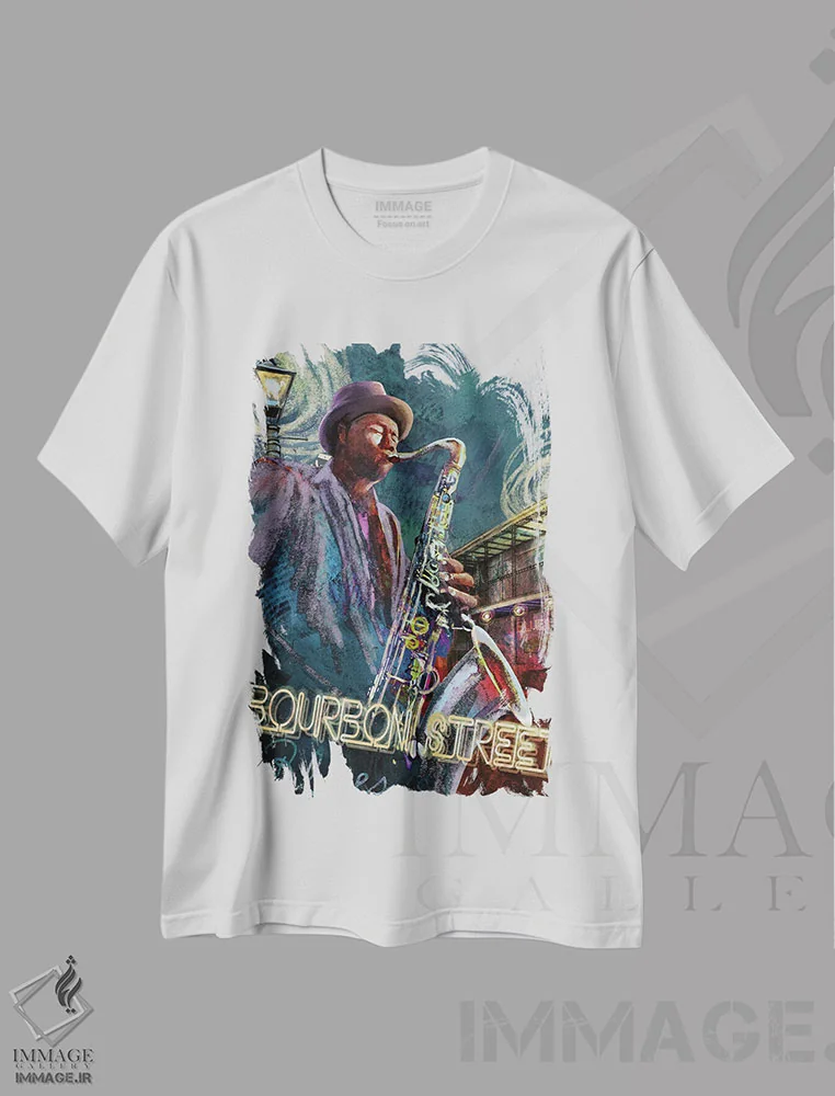 تیشرت سفید طرح دار بلوز خیابان بوربن، مدیوم اثر کنراد ناتسن | فروشگاه ایماژ تیشرت طرح دار بلوز خیابان بوربن اثر کنراد ناتسن