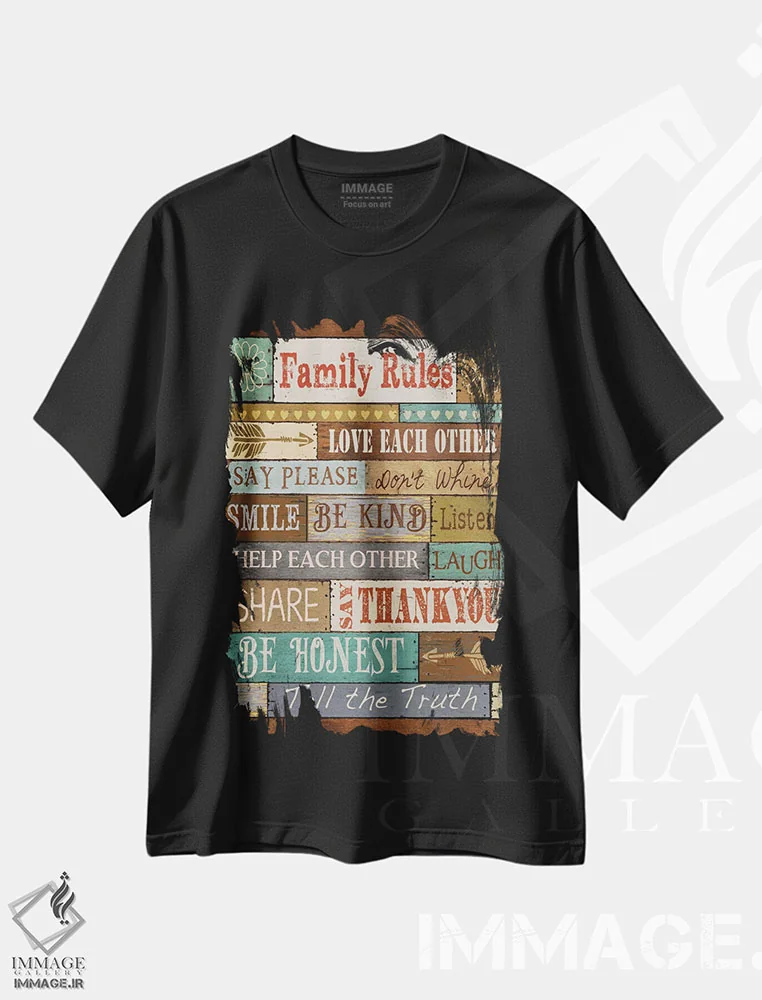 تیشرت مشکی طرح دار قوانین خانواده، تایپوگرافی اثر کنراد ناتسن | فروشگاه ایماژ تیشرت طرح دار قوانین خانواده اثر کنراد ناتسن