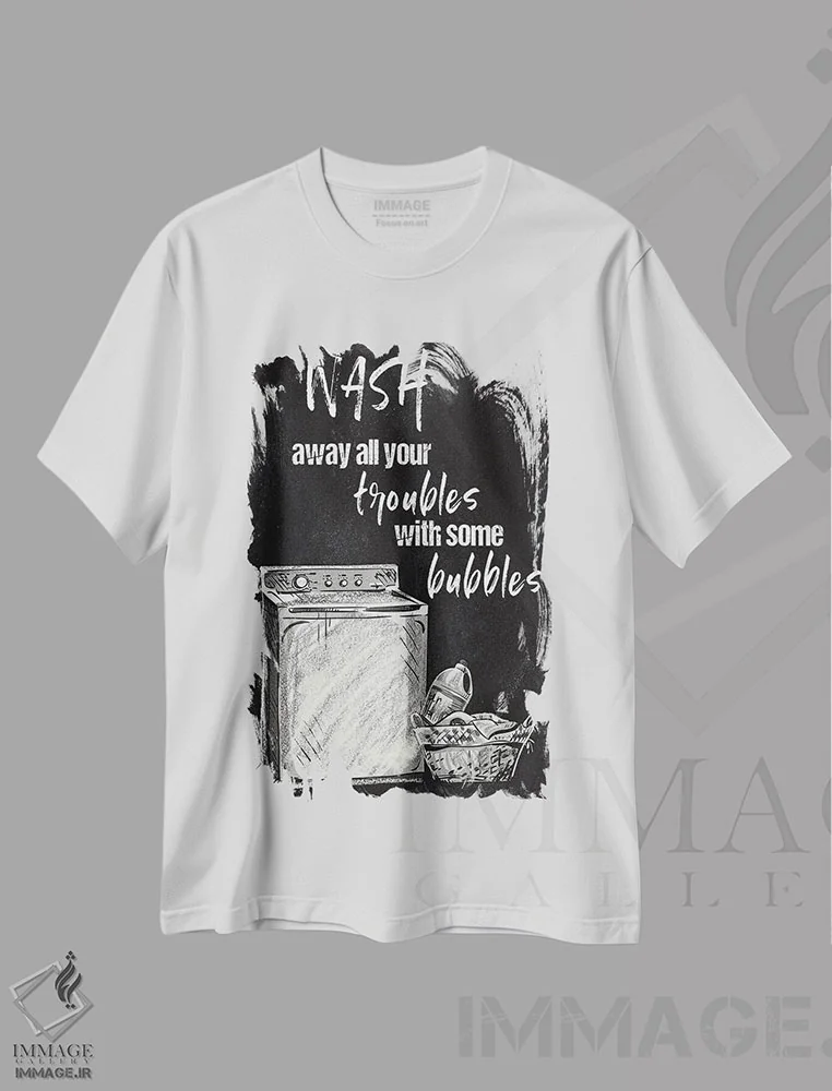 تیشرت سفید طرح دار دردهایت را بشوی، هنر تزئینی سیاه و سفید اثر کنراد ناتسن | فروشگاه ایماژ تیشرت طرح دار دردهایت را بشوی اثر کنراد ناتسن