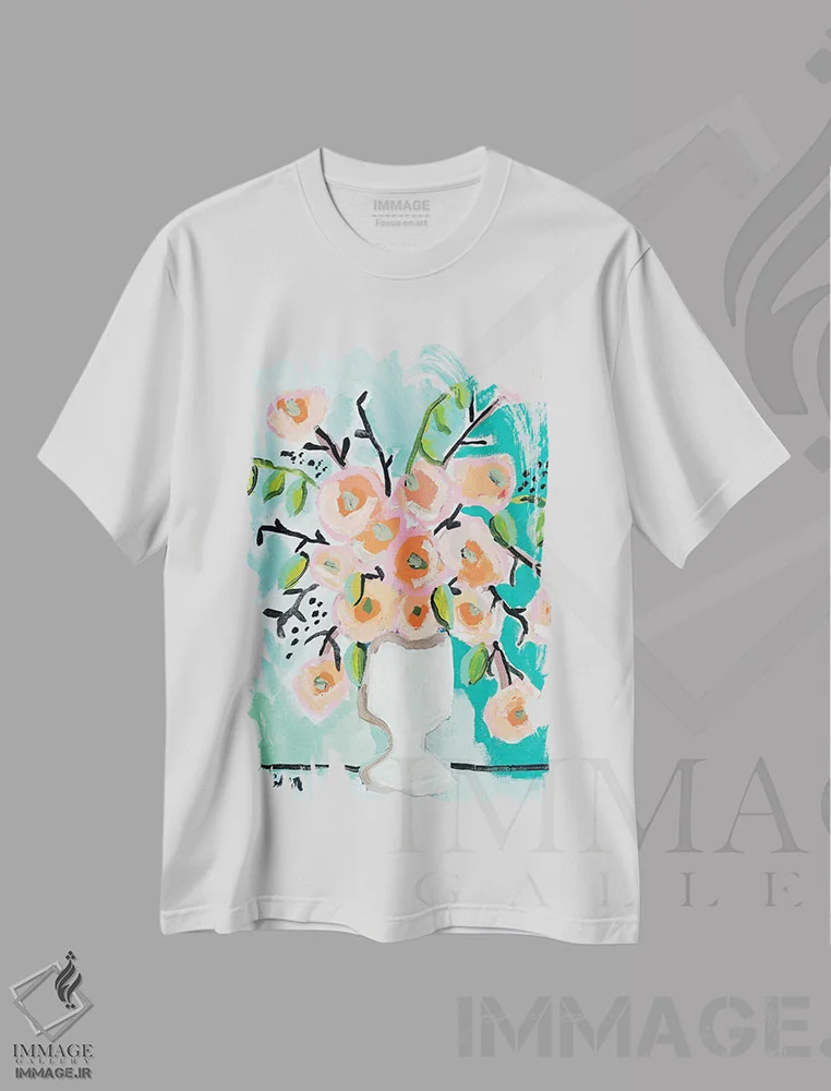 تیشرت سفید طرح دار شکوفه های تابستانی، دکور معاصر اثر کیت رابرتس | فروشگاه ایماژ تیشرت طرح دار شکوفه های تابستانی اثر کیت رابرتس