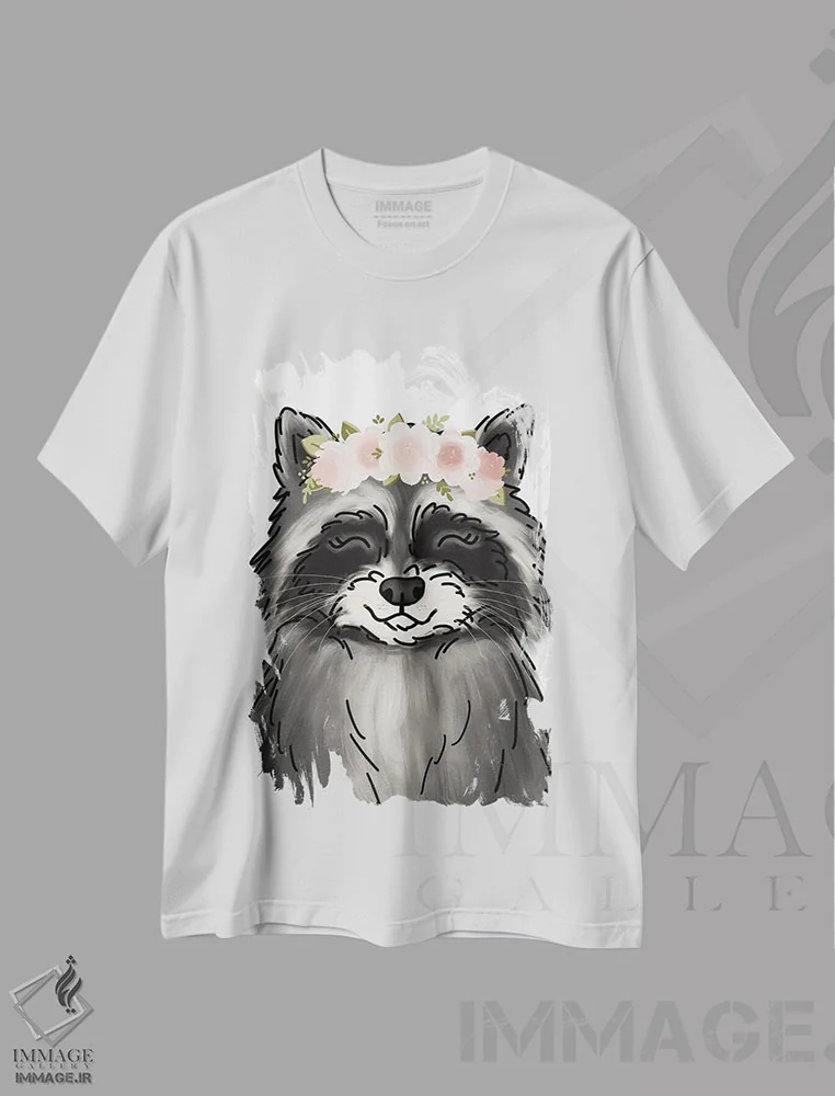 تیشرت سفید طرح دار راکون با تاج گل، دکور معاصر اثر کیتی برایانت | فروشگاه ایماژ تیشرت طرح دار راکون با تاج گل اثر کیتی برایانت