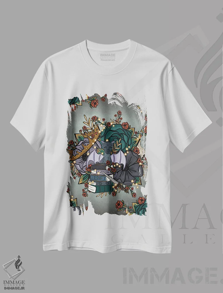 تیشرت سفید طرح دار گل های سبز افسون شده، تزئینی اثر کیتی برایانت | فروشگاه ایماژ تیشرت طرح دار گل های سبز افسون شده اثر کیتی برایانت