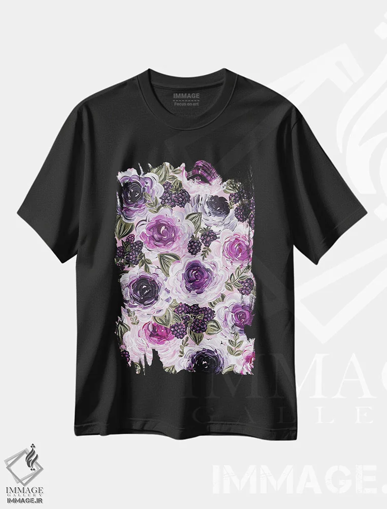 تیشرت مشکی طرح دار گل های تمشکی، هنر دیجیتال اثر کیتی برایانت | فروشگاه ایماژ تیشرت طرح دار گل های تمشکی اثر کیتی برایانت