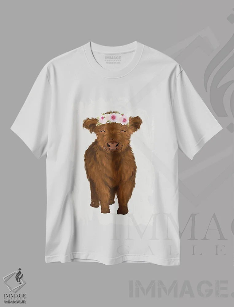 تیشرت سفید طرح دار گوساله هایلند بچه با تاج گل، دکور معاصر اثر کیتی برایانت | فروشگاه ایماژ تیشرت طرح دار گوساله هایلند بچه با تاج گل اثر کیتی برایانت