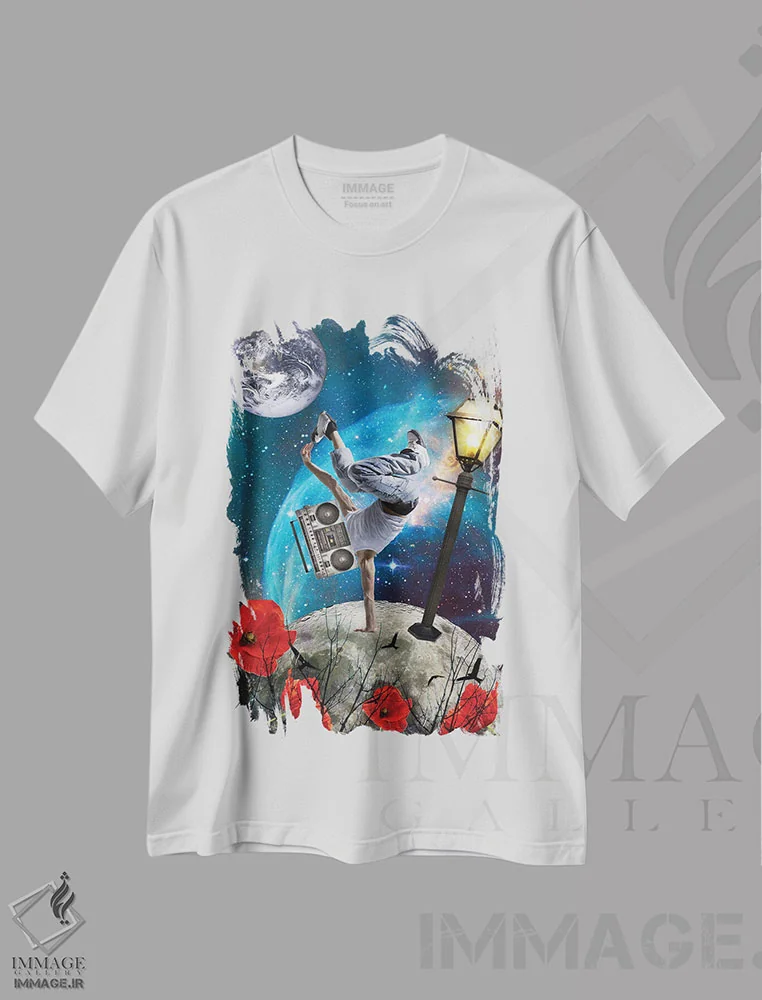 تیشرت سفید طرح دار جهان موسیقی است، عکاسی ترکیبی اثر کیکی سی لندن | فروشگاه ایماژ