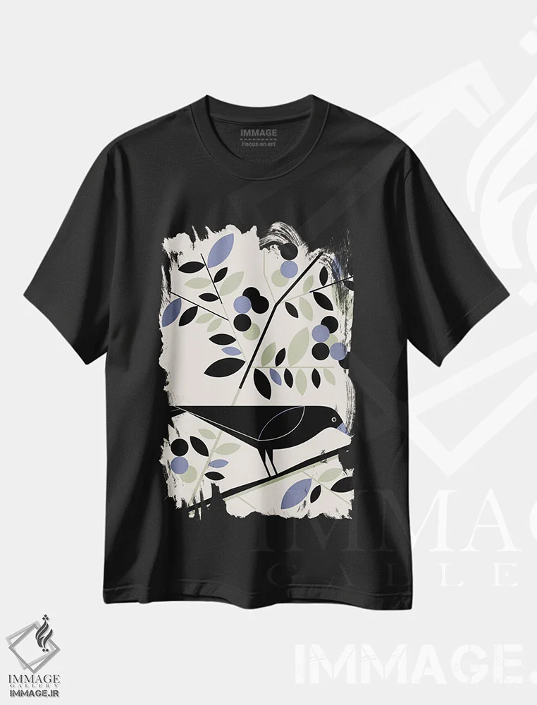 تیشرت مشکی طرح دار پرندگان و گل ها، دکور معاصر اثر گرگ مابلی | فروشگاه ایماژ تیشرت طرح دار پرندگان و گل ها اثر گرگ مابلی