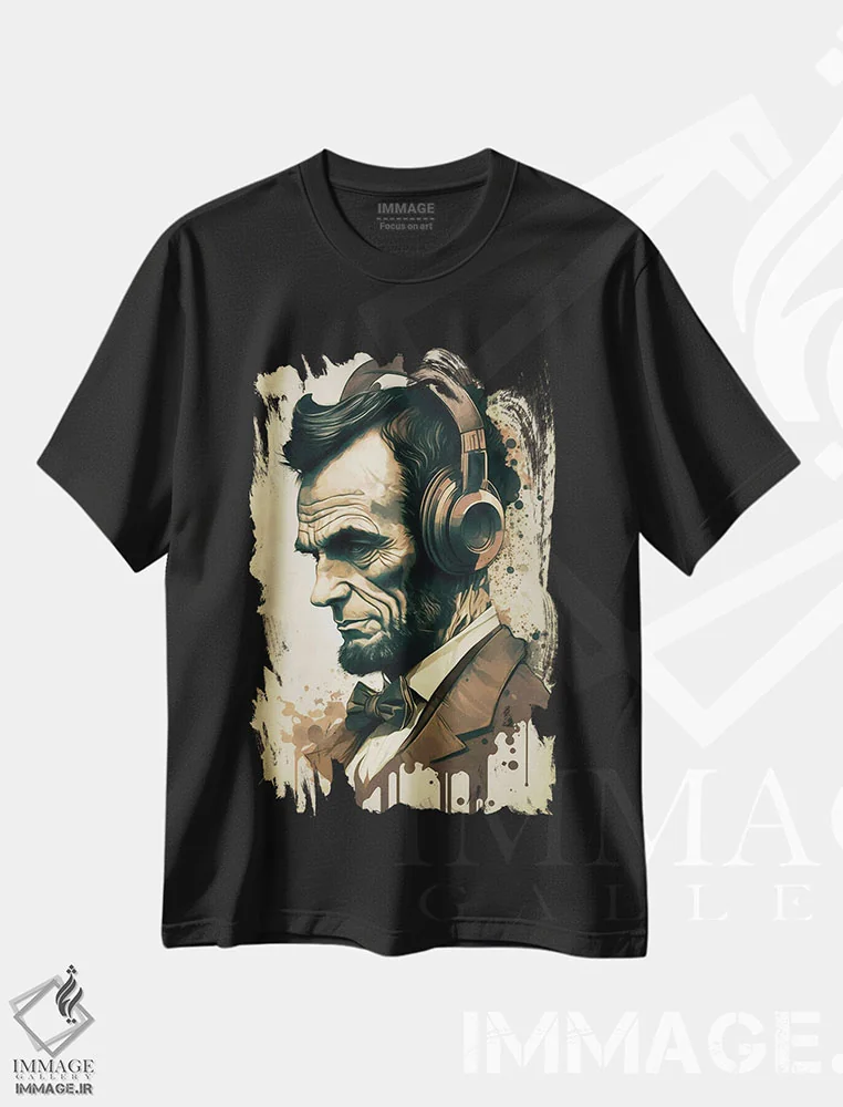 تیشرت مشکی طرح دار لینکلن با هدفون، هنر دیجیتال اثر دورو آرت | فروشگاه ایماژ تیشرت طرح دار لینکلن با هدفون اثر دورو آرت