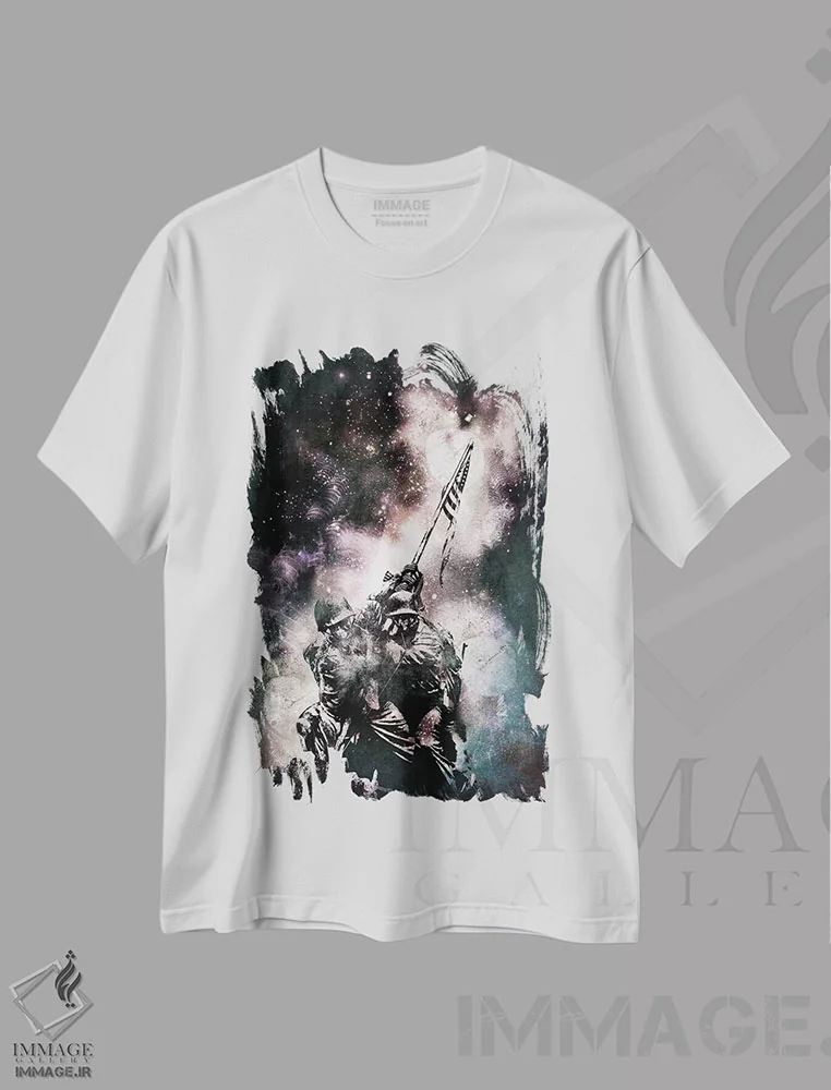 تیشرت سفید طرح دار برافراشتن پرچم، هنر دیجیتال اثر فایو بای فایو کالکتیو | فروشگاه ایماژ تیشرت طرح دار برافراشتن پرچم اثر فایو بای فایو کالکتیو