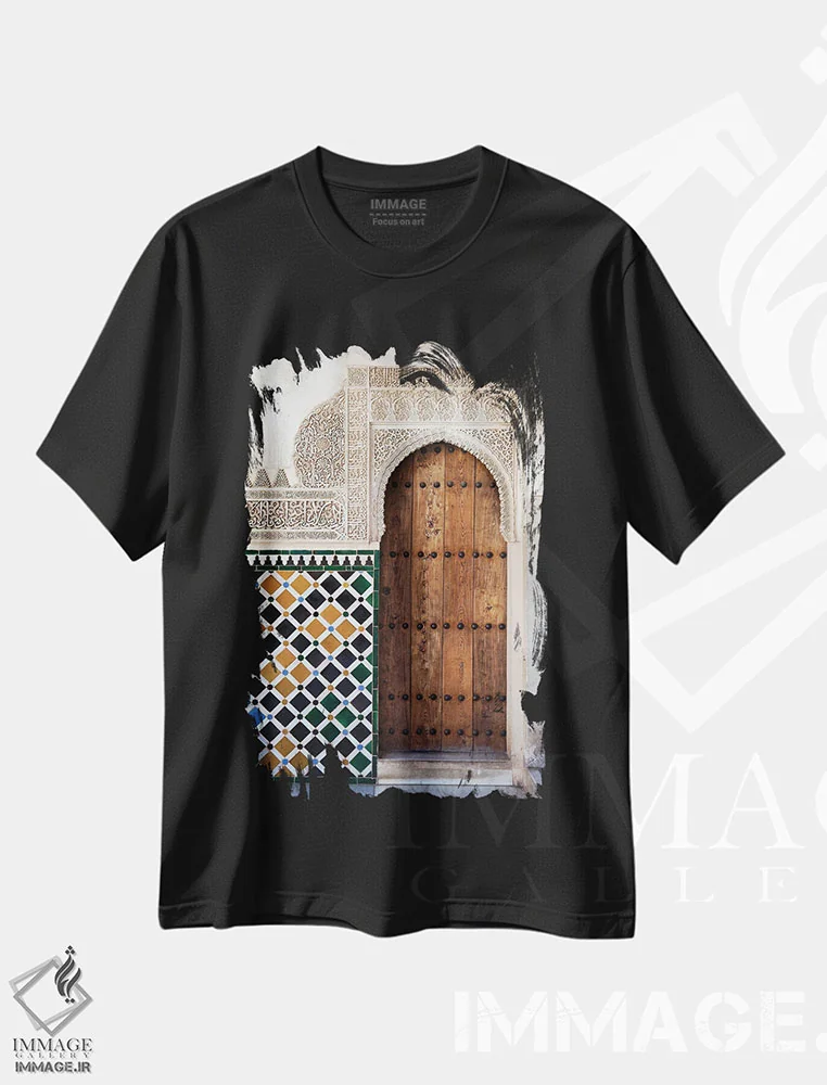 تیشرت مشکی طرح دار Spain,جزئیات درب الحمرا، اسپانیا، تزئینی اثر جین ریکس | فروشگاه ایماژ تیشرت طرح دار Spain,جزئیات درب الحمرا، اسپانیا اثر جین ریکس