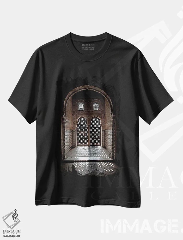 تیشرت مشکی طرح دار آثار جین ریکس - immage.ir تیشرت طرح دار Alhambra, Spain,پنجره عربسک در نور خورشید، الحمرا، اسپانیا اثر جین ریکس