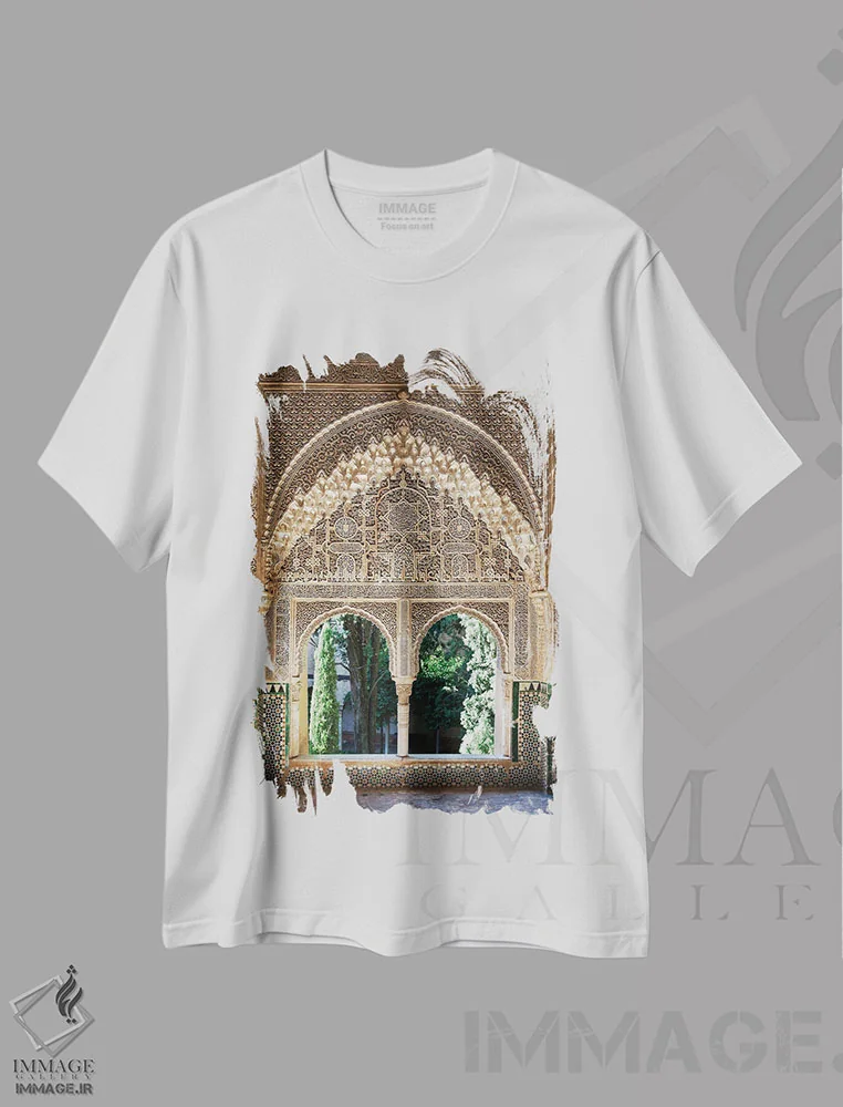 تیشرت سفید طرح دار Alhambra, Spain,پنجره با طراحی موریسالحمرا، اسپانیا، تزئینی اثر جین ریکس | فروشگاه ایماژ تیشرت طرح دار Alhambra, Spain,پنجره با طراحی موریسالحمرا، اسپانیا اثر جین ریکس