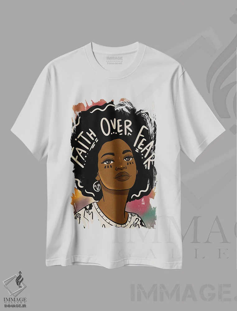 تیشرت سفید طرح دار ایمان بر ترس، هنر آمریکایی آفریقایی تبار اثر بری پیپنز | فروشگاه ایماژ تیشرت طرح دار ایمان بر ترس اثر بری پیپنز
