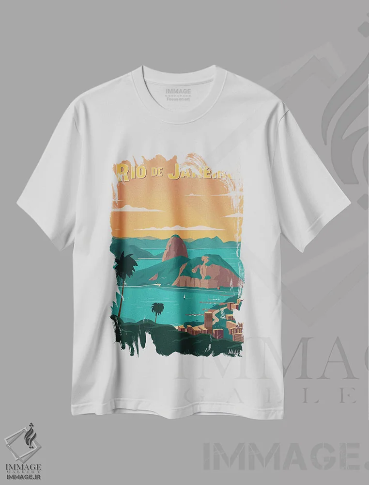 تیشرت سفید طرح دار ریو دو ژانیرو، تایپوگرافی اثر ایدیااستورم استودیوز | فروشگاه ایماژ تیشرت طرح دار ریو دو ژانیرو اثر ایدیااستورم استودیوز