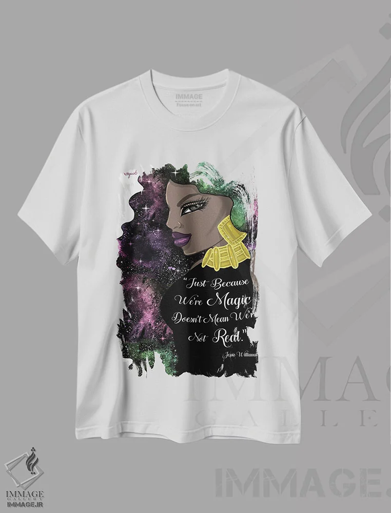 تیشرت سفید طرح دار ما جادو هستیم، هنر آمریکایی آفریقایی تبار اثر جانکول آرت | فروشگاه ایماژ تیشرت طرح دار ما جادو هستیم اثر جانکول آرت