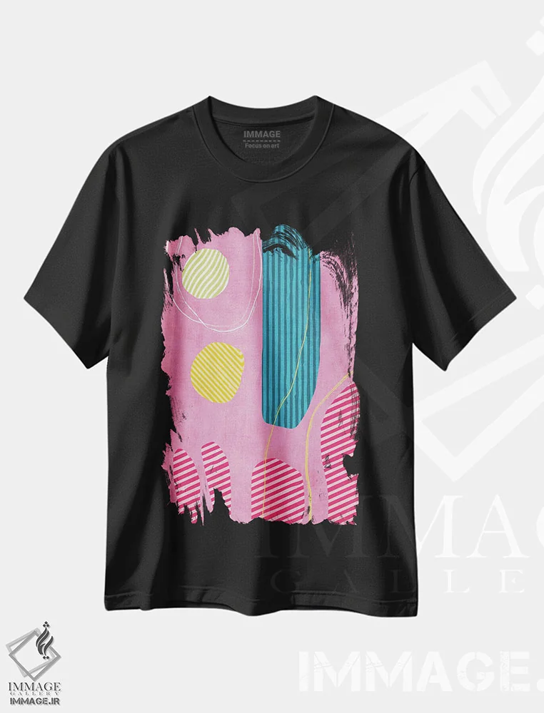 تیشرت مشکی طرح دار انتزاعی صورتی زرد آبی اثر ام سی دیزاین لب | فروشگاه ایماژ تیشرت طرح دار انتزاعی صورتی زرد آبی اثر ام سی دیزاین لب