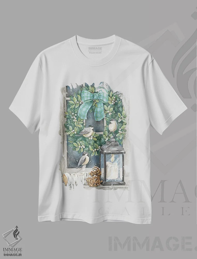 تیشرت سفید طرح دار حلقه گل زمستانی، دکور تعطیلات اثر دایان کاتر | فروشگاه ایماژ تیشرت طرح دار حلقه گل زمستانی اثر دایان کاتر