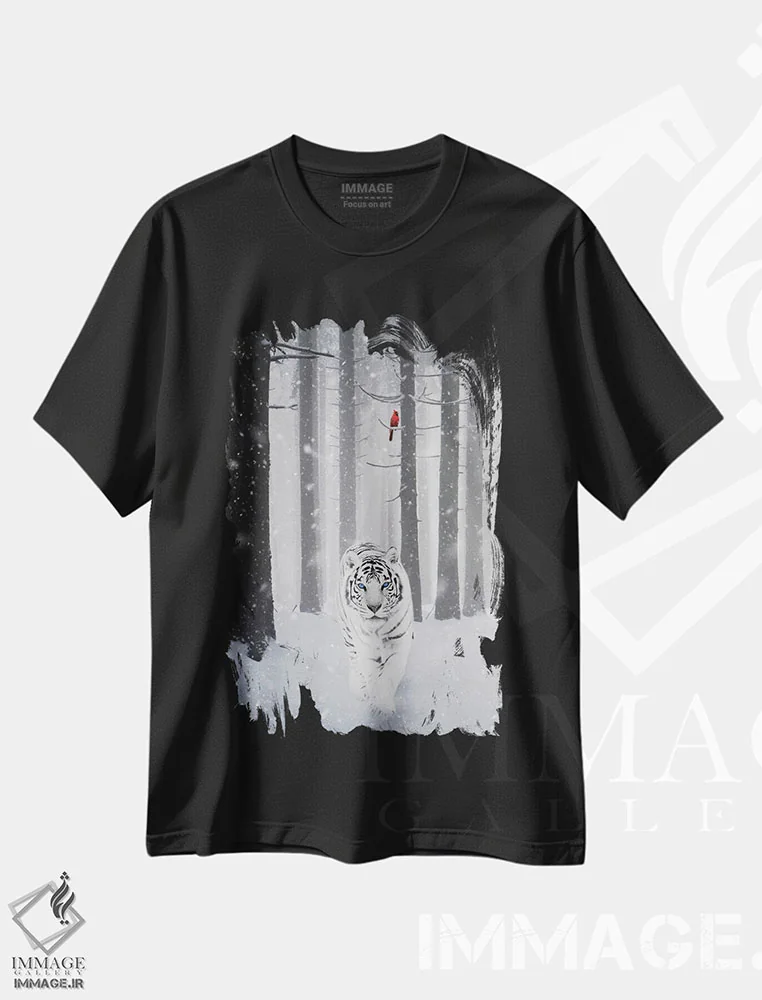 تیشرت مشکی طرح دار ببر سفید و پرنده کاردینال قرمز زیر برف در جنگل، عکاسی ترکیبی اثر جن زد | فروشگاه ایماژ تیشرت طرح دار ببر سفید و پرنده کاردینال قرمز زیر برف در جنگل اثر جن زد
