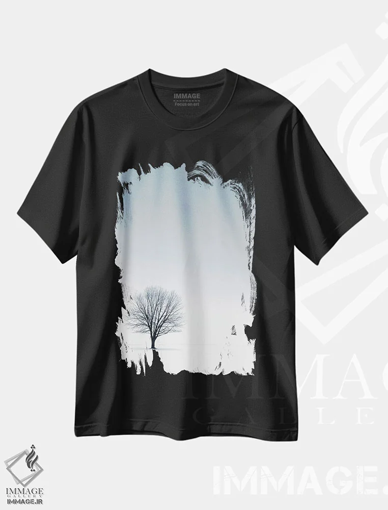 تیشرت مشکی طرح دار درخت در منظره زمستانی، دکور تعطیلات اثر فوتوآی ان سی استودیو | فروشگاه ایماژ تیشرت طرح دار درخت در منظره زمستانی اثر فوتوآی ان سی استودیو