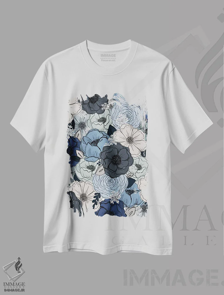 تیشرت سفید طرح دار گل های یخ زده، تزئینی اثر کیتی برایانت | فروشگاه ایماژ تیشرت طرح دار گل های یخ زده اثر کیتی برایانت