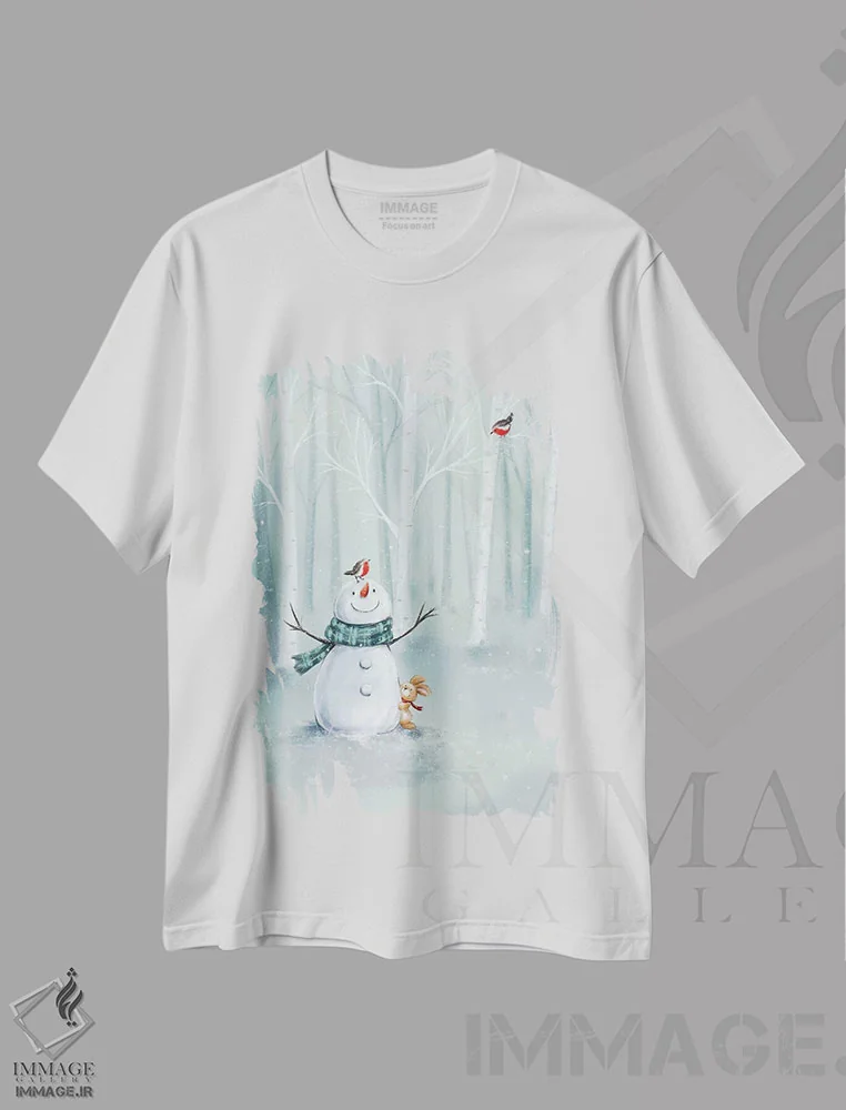 تیشرت سفید طرح دار – تیشرت فصلی ,"آدم برفی در جنگل " اثر ماکیکو فروشگاه ایماژ تیشرت طرح فصلی ,"آدم برفی در جنگل " اثر ماکیکو