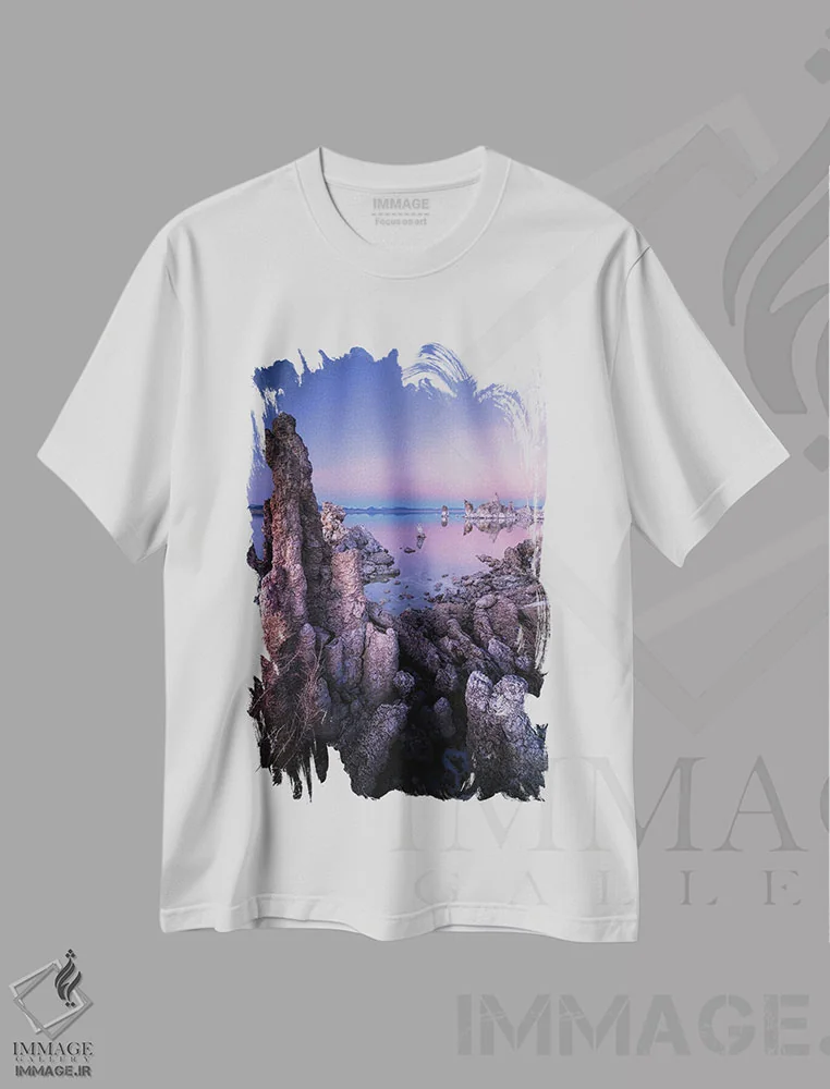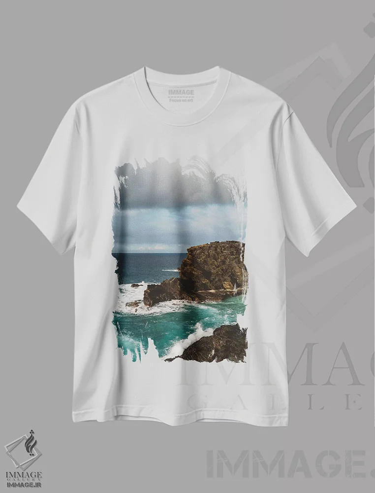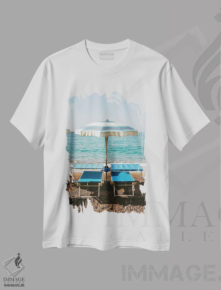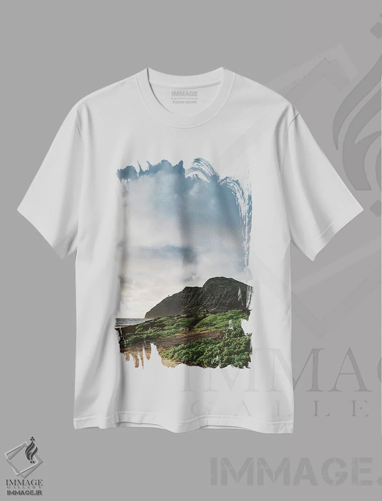 تیشرت سفید طرح دار ادغام ساحل و آسمان، عکاسی ترکیبی اثر جن زد | فروشگاه ایماژ تیشرت طرح دار ادغام ساحل و آسمان اثر جن زد