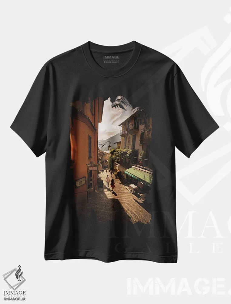 تیشرت مشکی طرح دار بلاژیو، دریاچه کومو، ایتالیا، مدیوم اثر انزو رومانو | فروشگاه ایماژ تیشرت طرح دار بلاژیو، دریاچه کومو، ایتالیا اثر انزو رومانو