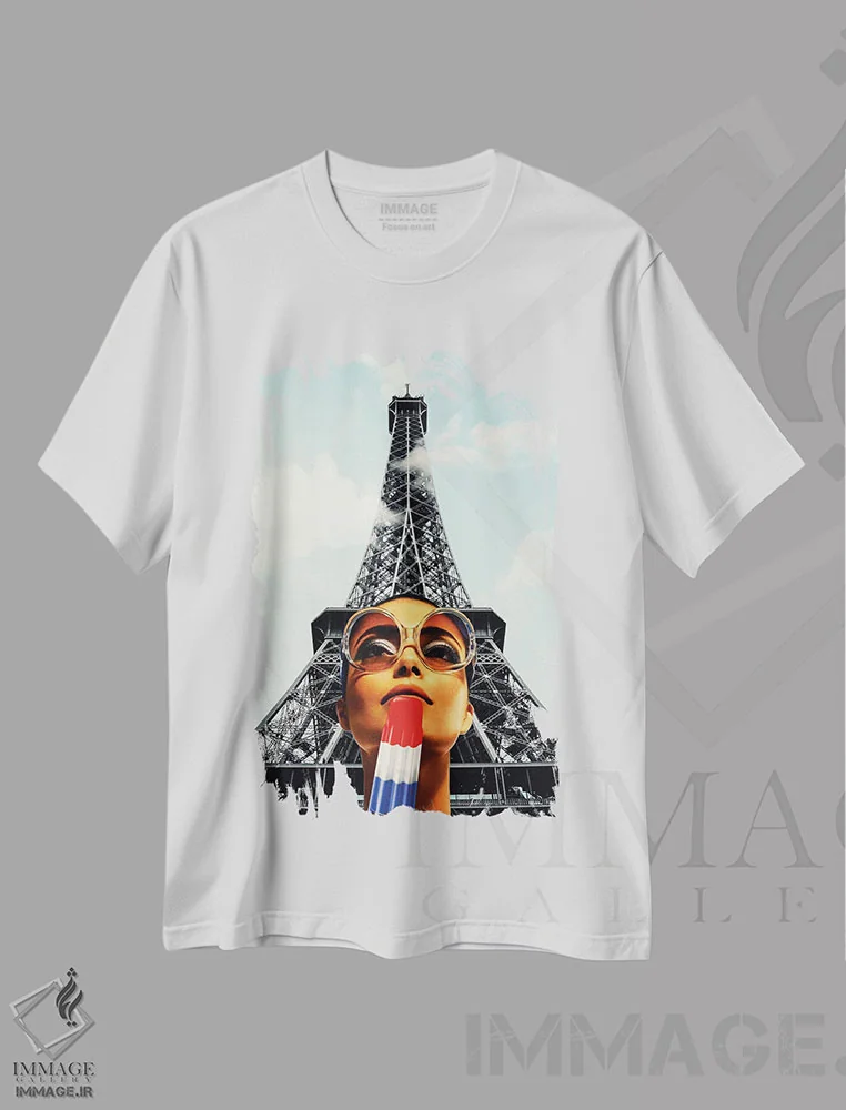 تیشرت سفید طرح دار تابستان در پاریس، مدیوم اثر کیکی سی لندن | فروشگاه ایماژ تیشرت طرح دار تابستان در پاریس اثر کیکی سی لندن
