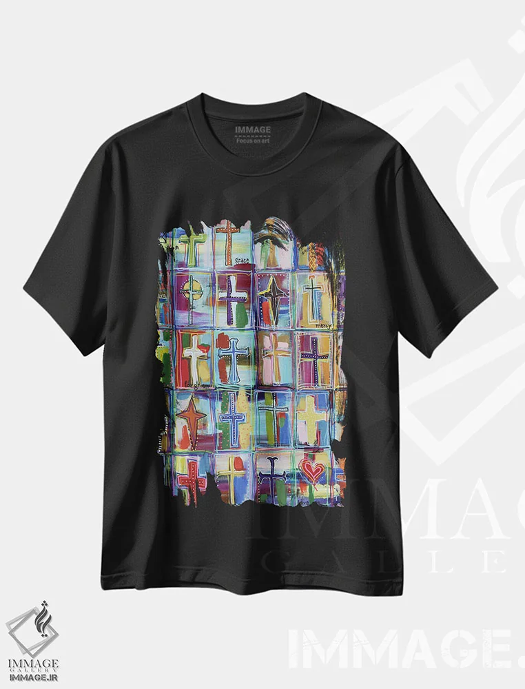 تیشرت مشکی طرح دار کلاژ صلیب مقدس، هنر دیجیتال اثر دیویدای هینْدز | فروشگاه ایماژ تیشرت طرح دار کلاژ صلیب مقدس اثر دیویدای هینْدز